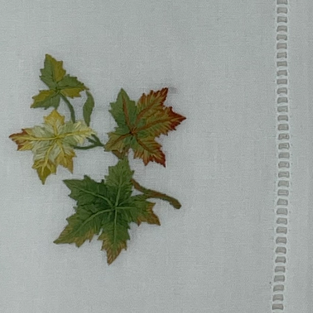 Elevate your dining experience with this gorgeous napkin set. Combining an embroidered fall leaf design with a hemstitch border, this napkin set entices guests to look forward to the meal to come.