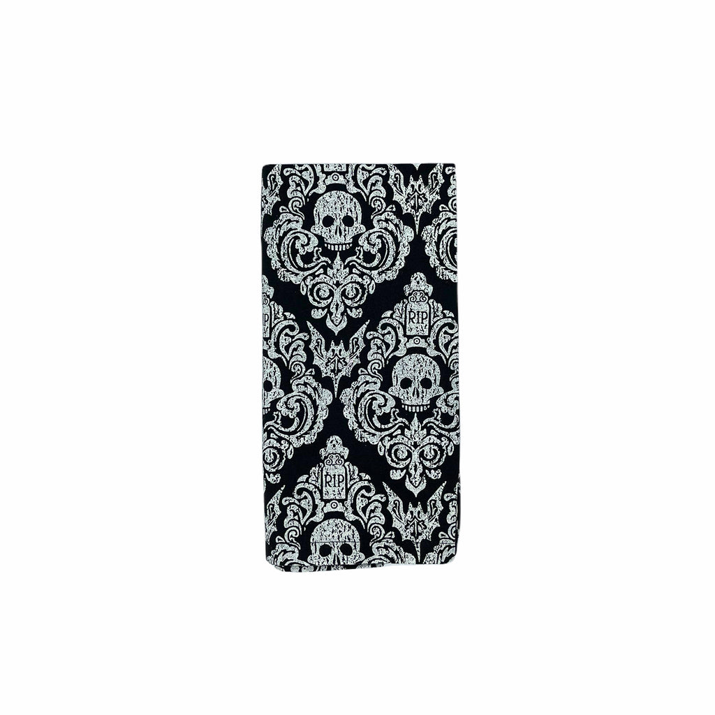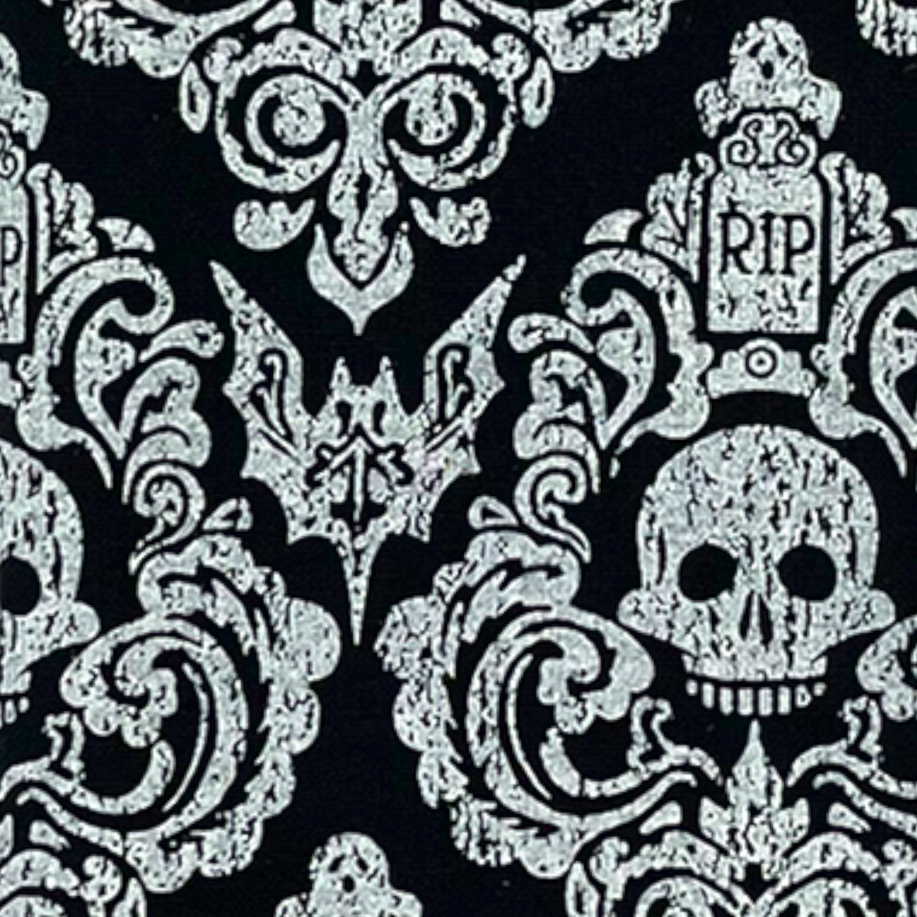 Bring a spooky look to your Halloween tablescape with this set of 4 Graveyard Damask Napkins. Each napkin features damask style embellishing in white on a black background with a fun skull and tombstone pattern .