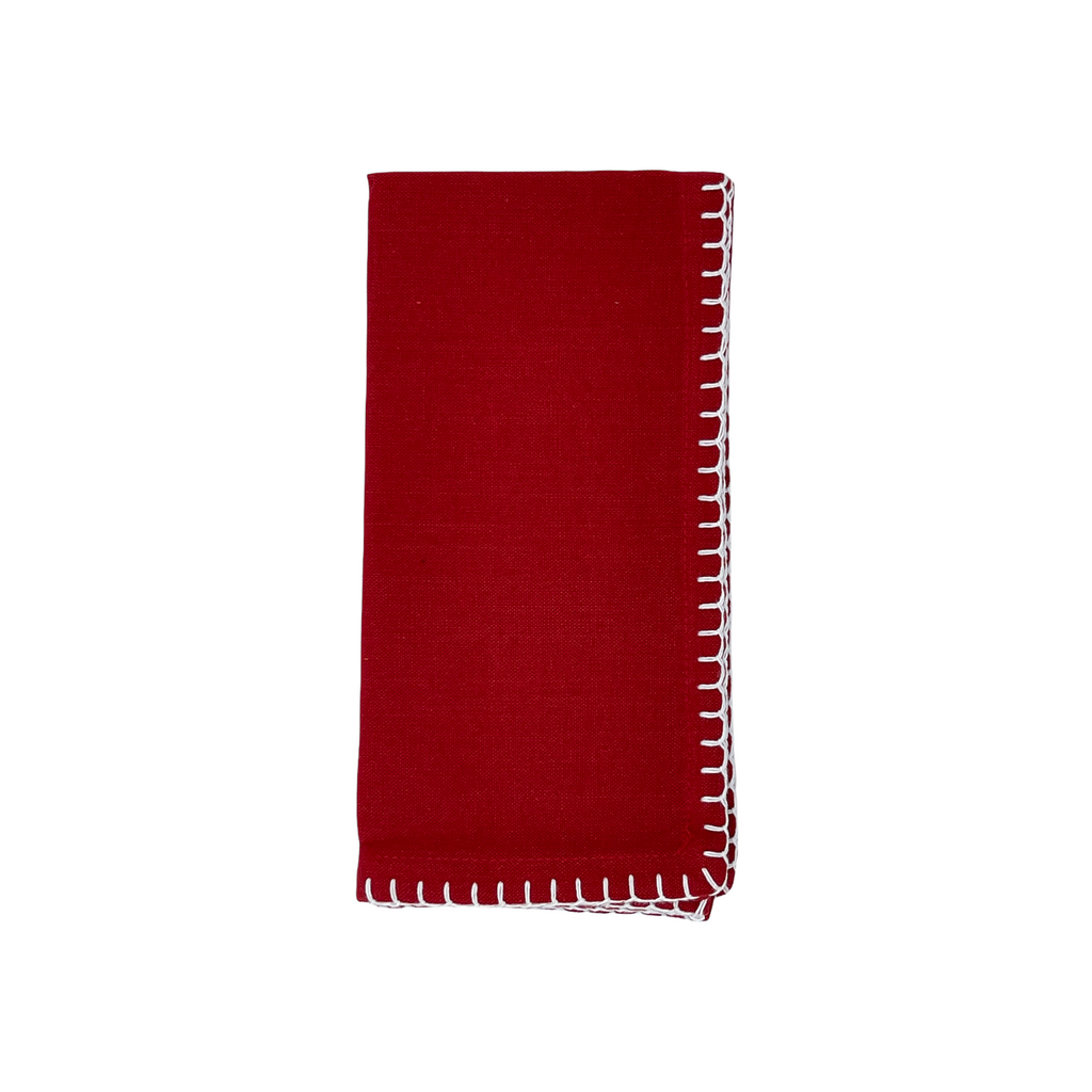 This whip stitched napkin has a rich, artisan look and lends elevated design interest to any room. The red tone with white stitching is a fun and festive look! For a complete look, pair with our whipped stitched placemat.