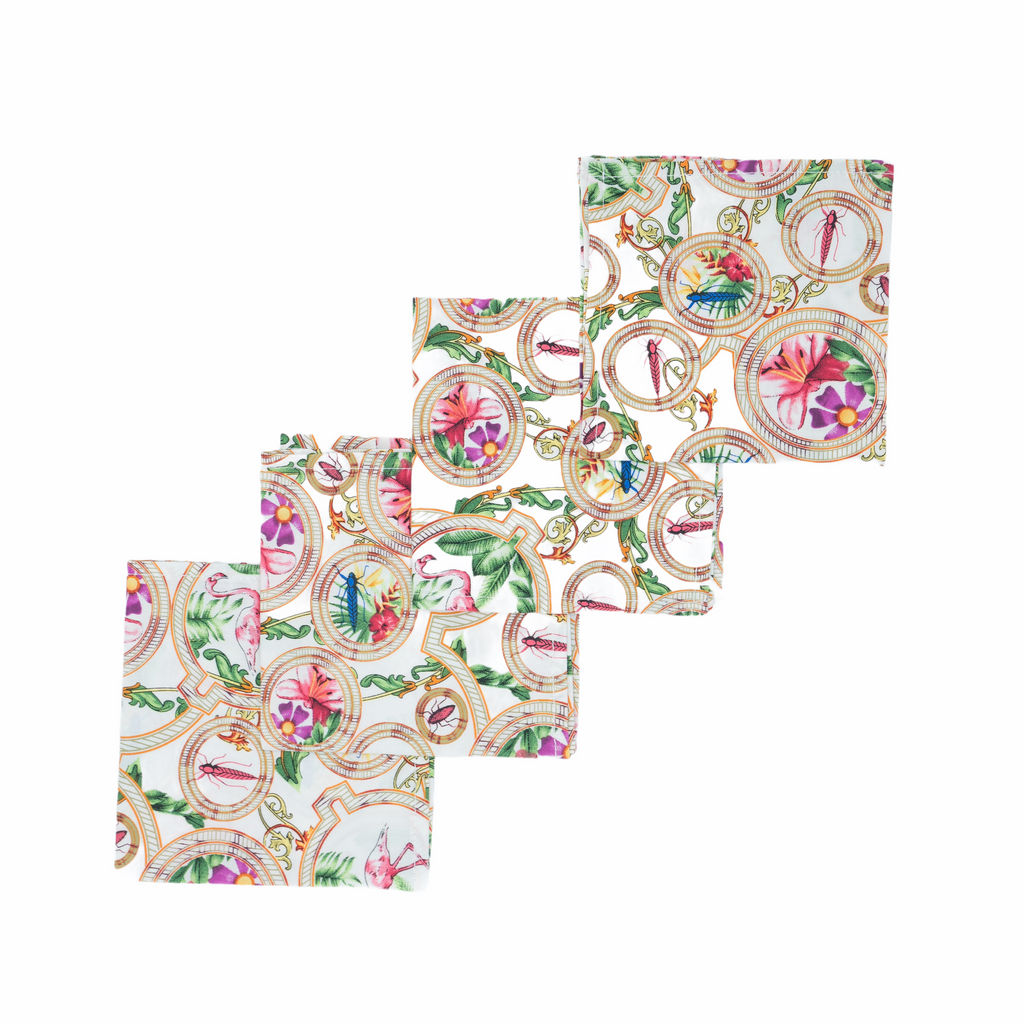 This tropical-themed flamingo print, complete with florals and grasshoppers, will add a splash of fun and color to summer entertaining.