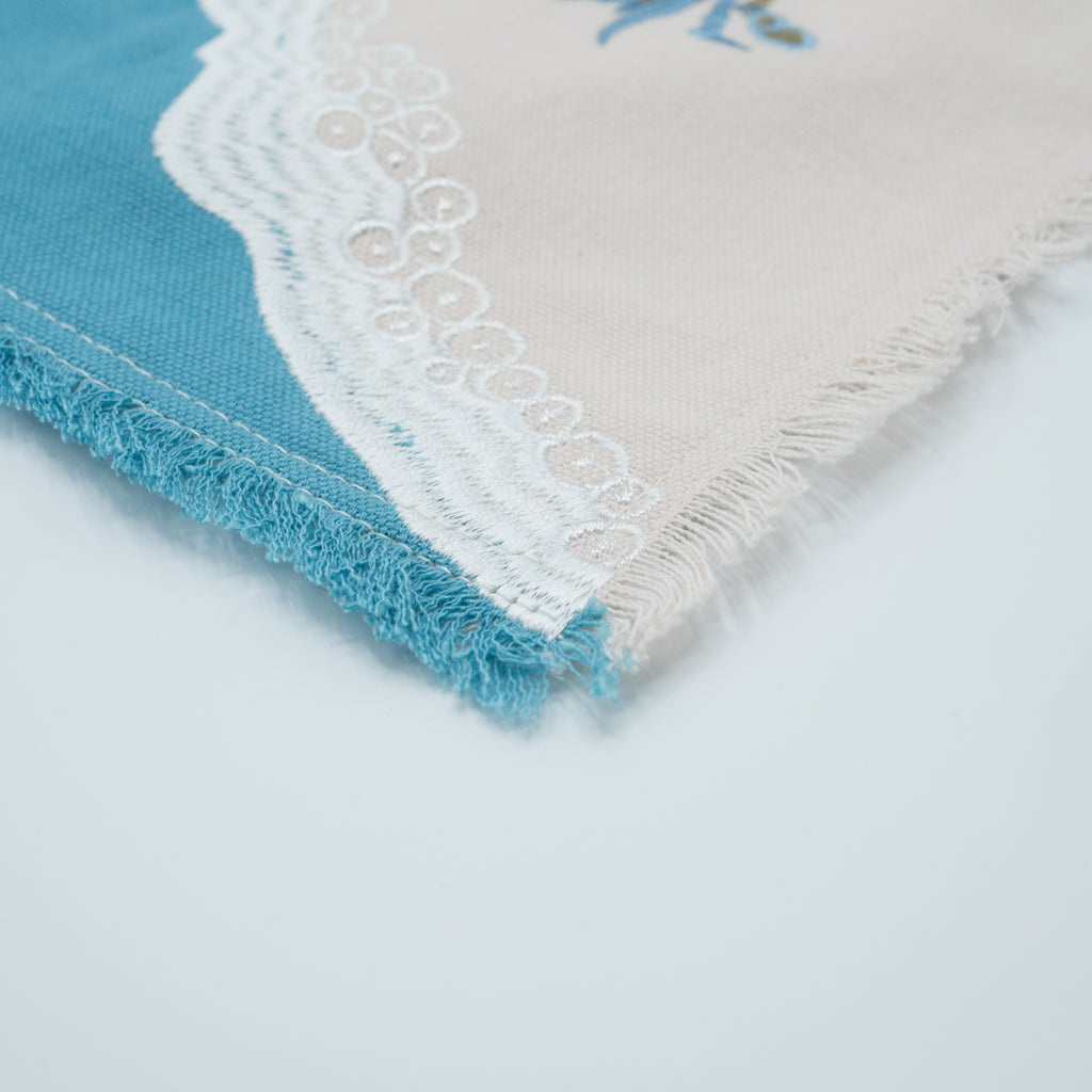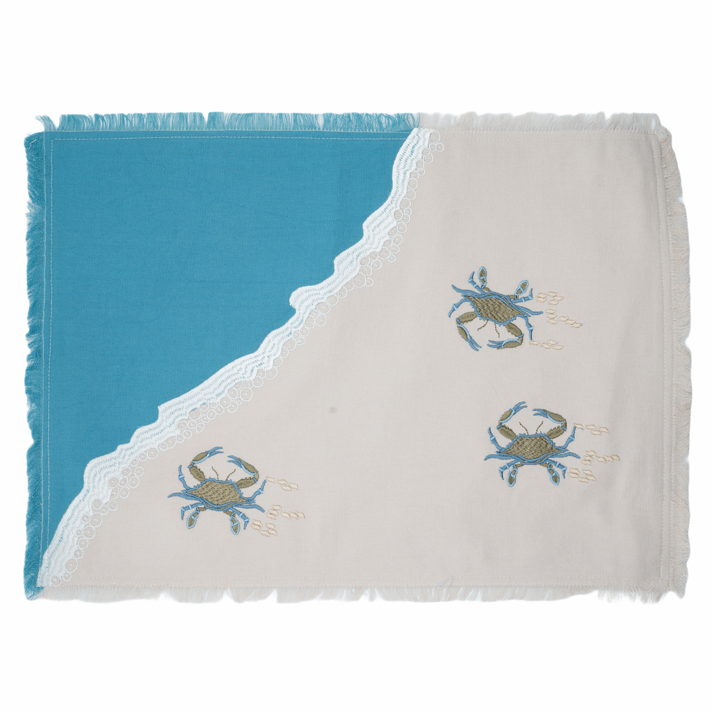 Natural sand and ocean blue cotton placemats are embroidered with baby crabs scurrying on the sand. Fun, but adds a sophisticated touch to your home. Summer is here!