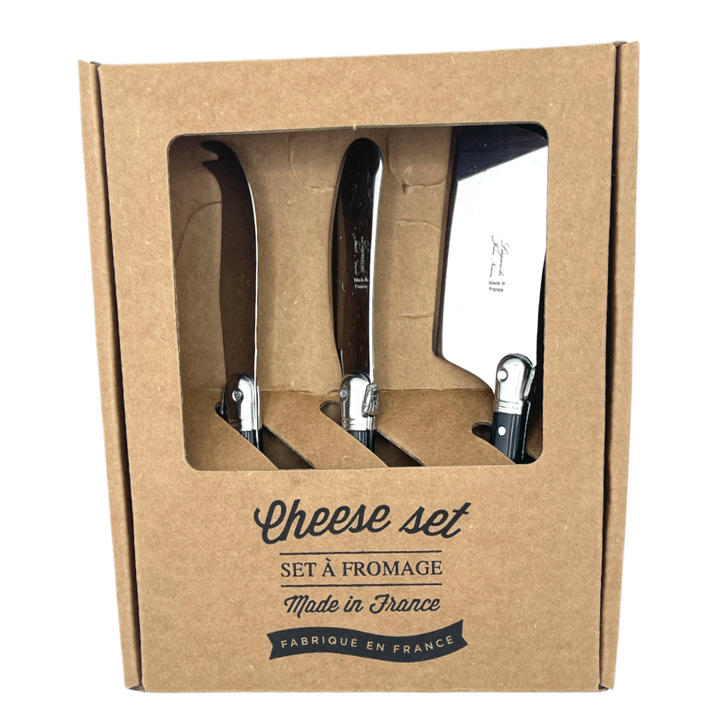 Laguiole Mini Cheese Set. Utensils have black handle and come in brown cardboard box. Crafted from high quality stainless steel and resin, these pieces make a lively addition to any dining experience. Set of three utensils includes: Hard cheese cutter, Soft cheese spreader Fork tipped knife