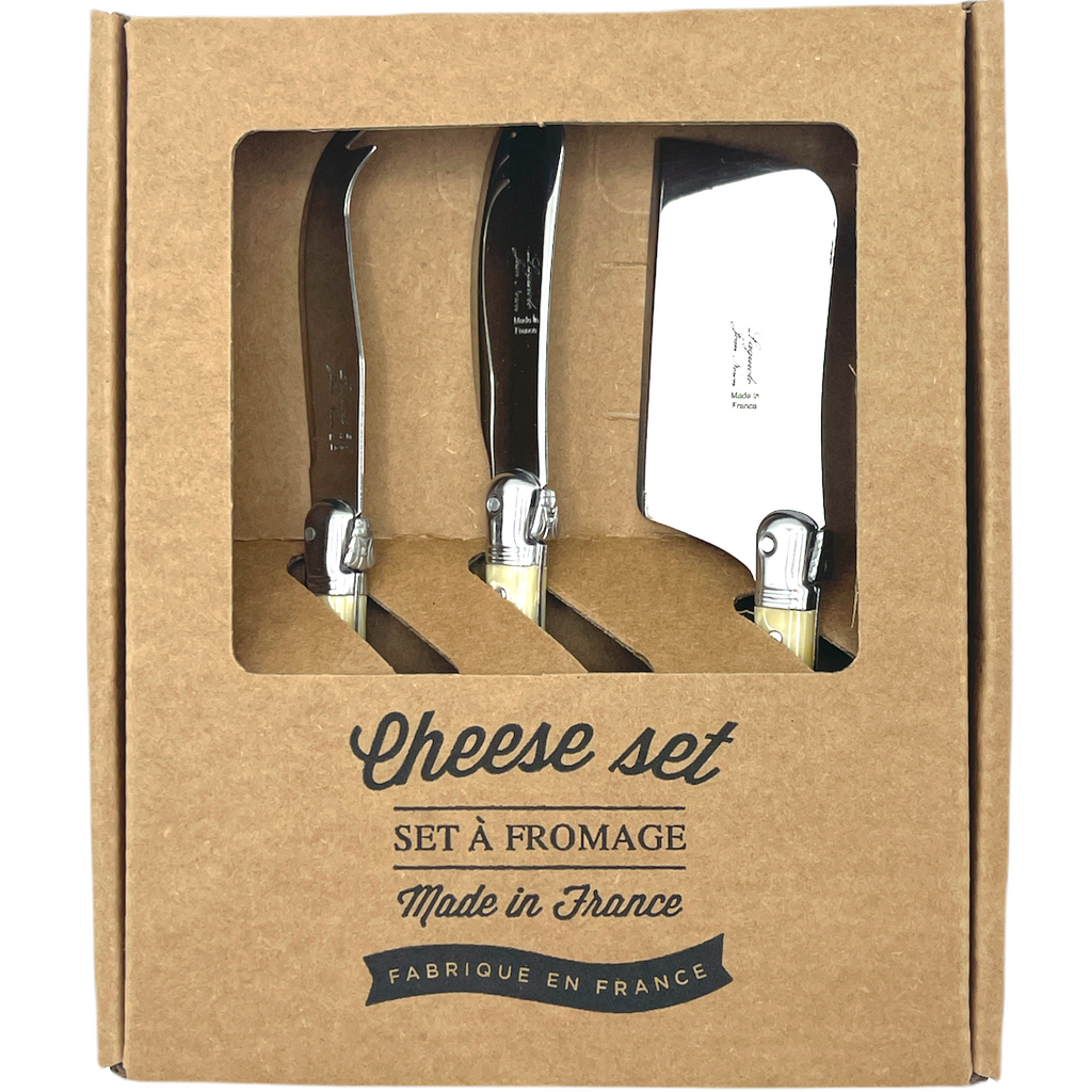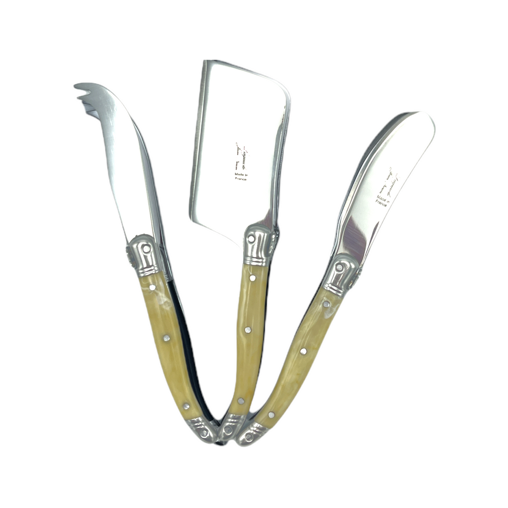 Laguiole Mini Cheese Set. Utensils have pale horn handle and come in brown cardboard box. Crafted from high quality stainless steel and resin, these pieces make a lively addition to any dining experience. Set of three utensils includes: Hard cheese cutter, Soft cheese spreader Fork tipped knife