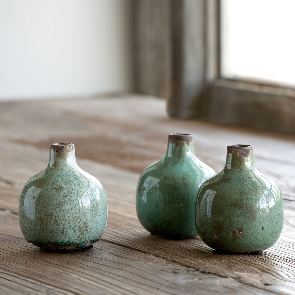 In beautiful assorted colors of blues and greens, these 3 stoneware bud vases have an antiqued crackled glazed finish. Use together to hold your favorite blossoms or just as captivating as an accent on your table.